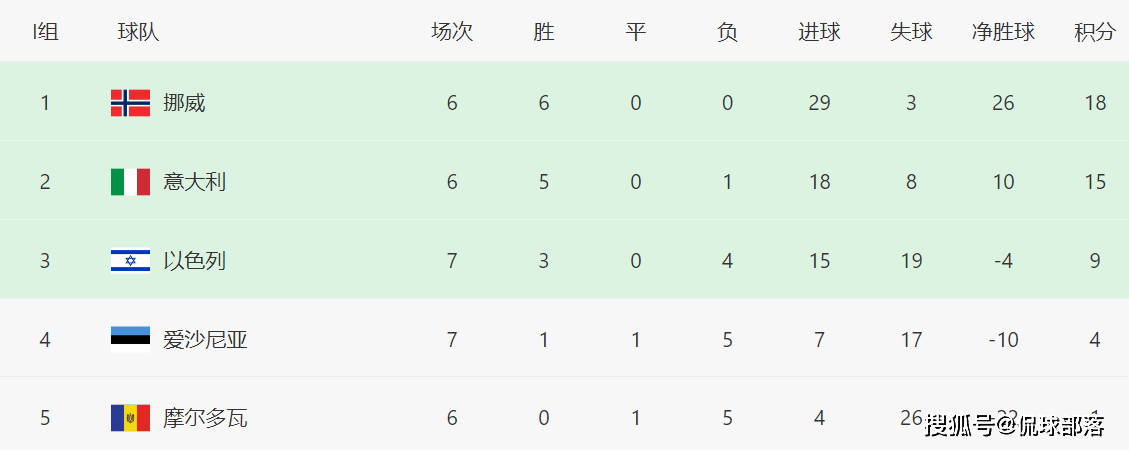 小组最新积分榜,挪威6轮积18分稳居第一,意大利积15分排名第二,由于仅剩两轮,意大利提前锁定前二名,接下来的悬念将是挪威、意大利的头名之争。