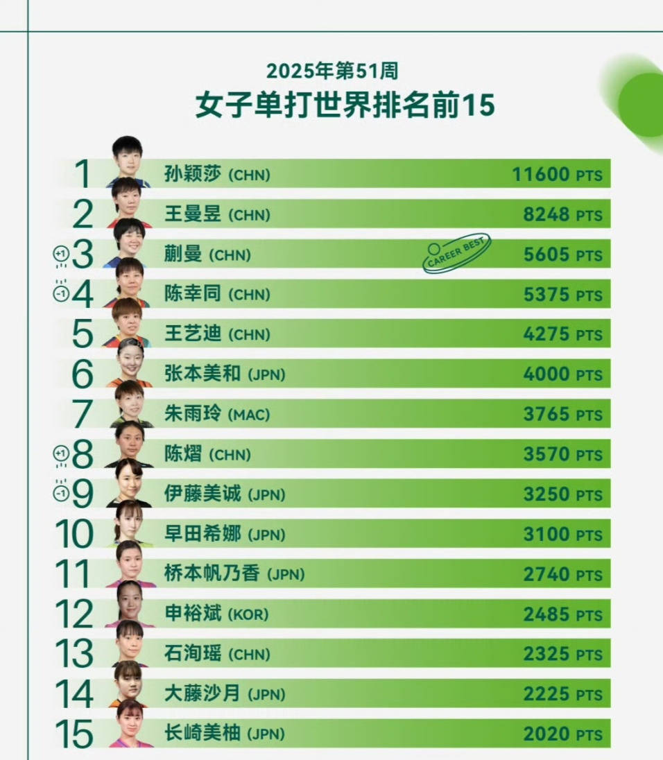 可惜因为受伤无缘争夺男女单打冠军,总决赛结束后,国际乒联2025年第51周世界排名火热出炉,中国女将包揽前五位:孙颖莎以11600分的积分,牢牢占据世界第一宝座。刚刚夺得WTT香港总决赛女子单打冠军的王曼昱排在第二。