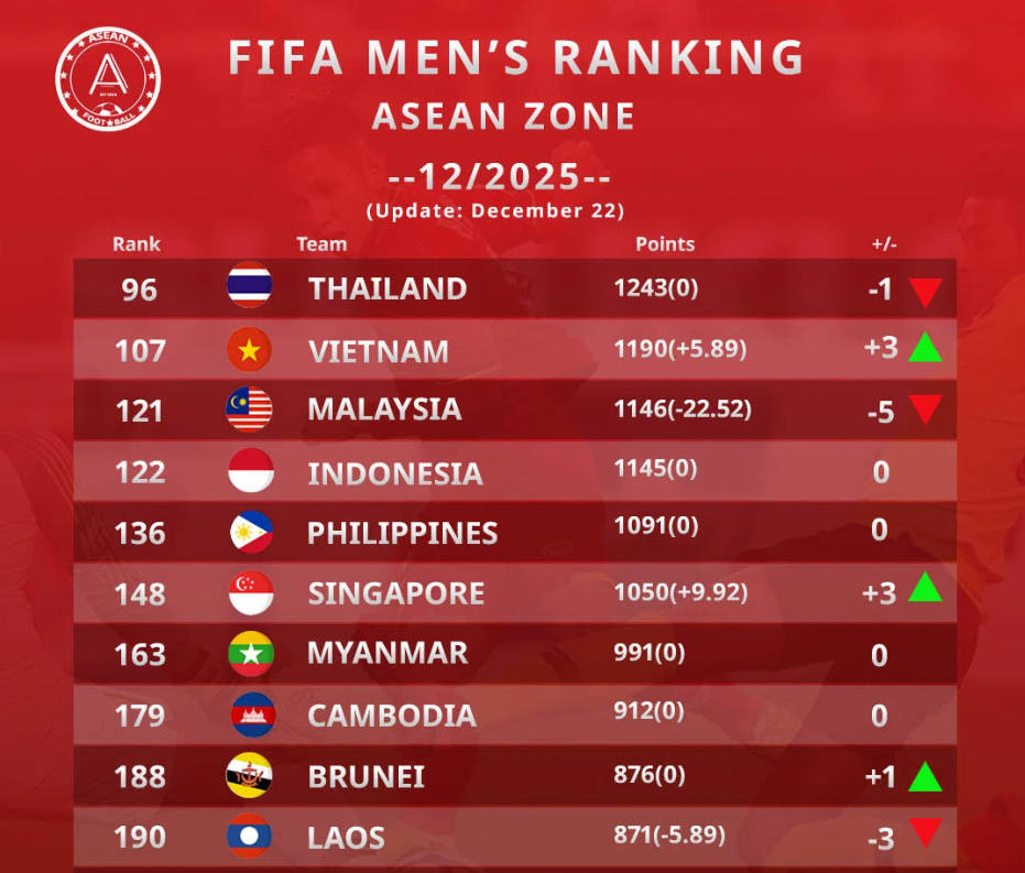 体育投注,体育投注平台,体育投注app,体育赛事,世界杯,奥运会,NBA,实时比分,体育新闻,欧洲杯,英超赛程,西甲赛程根据国际足联最新于12月22日发布的世界足球排名,越南国家男子足球队在榜单上实现了显著提升,上升了3个位次,现排名第107名。这一进步不仅彰显了球队竞技实力的稳健增长,而且使得越南足球离打入世界前100强国仅差7个名次,突破百强大关这一曾经被视为难以企及的里程碑也因此更加触手可及。