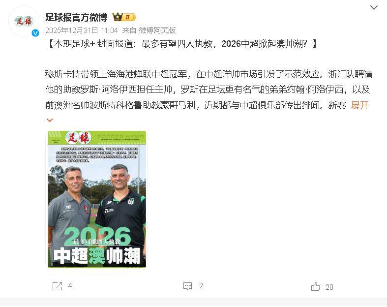 近日,一则消息如重磅炸弹般引爆了中国足球圈:2026赛季的中超联赛,极有可能迎来一波“澳洲教练潮”。届时,或许将有多达四位澳大利亚籍主教练同时执掌中超球队,甚至有可能上演阿洛伊西兄弟间的“德比”对决!中超联赛,或将成为澳大利亚籍教练在亚洲足坛最大的海外聚集地。