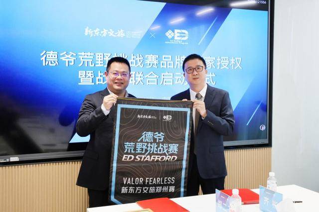 活动现场,施柯与陈华俊分别代表新东方文旅集团与香港山成集团(PPW)签署战略合作协议。双方发布“德爷荒野挑战赛”,并携手完成“德爷荒野挑战赛”战旗授旗仪式,象征赛事正式启航。