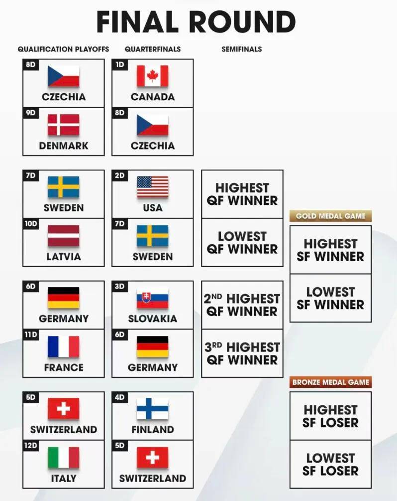 在万众瞩目的冰球赛场上,加拿大与美国这两支夺冠热门队伍,以全胜姿态强势晋级八强。而在一组汇集了东道主、卫冕冠军以及上届四强队伍的“死亡之组”中,芬兰队与斯洛伐克队历经一番苦战才艰难突围。瑞典队则因小分劣势,不得不进入附加赛,但他们以5比1的比分兵不血成地击败了拉脱维亚队,成功锁定了与美国队争夺四强席位的一席之地。随着八强对阵尘埃落定,米兰圣茱莉亚冰球馆在接下来的四个比赛日里,无疑将成为本届冬奥会最受瞩目的焦点。